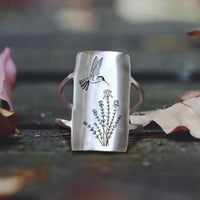 This hummingbird ring has a feel for garden serenity. It shows a hummingbird gathering nectar.