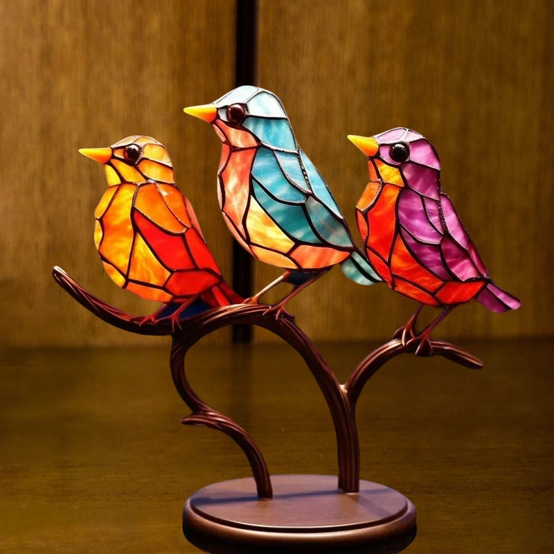 Each bird is a unique work of art made from vibrant stained glass that captures the light beautifully, creating a mesmerizing display of color. Perched on a sturdy branch, the glass bird creates an enchanting scene that is both realistic and whimsical.